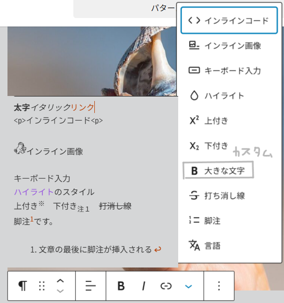 段落ブロックでは基本的な文章、様々なスタイルの文字を入力できます。